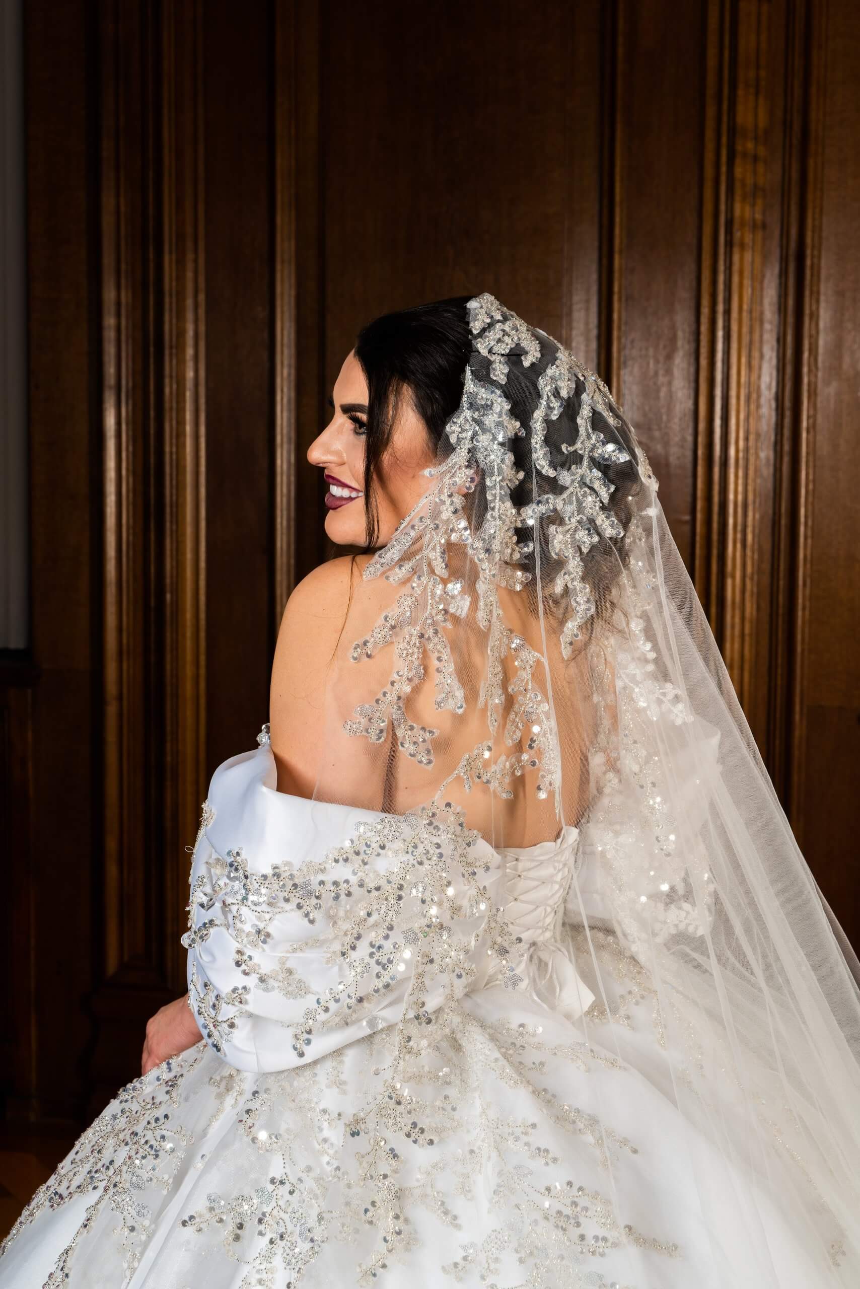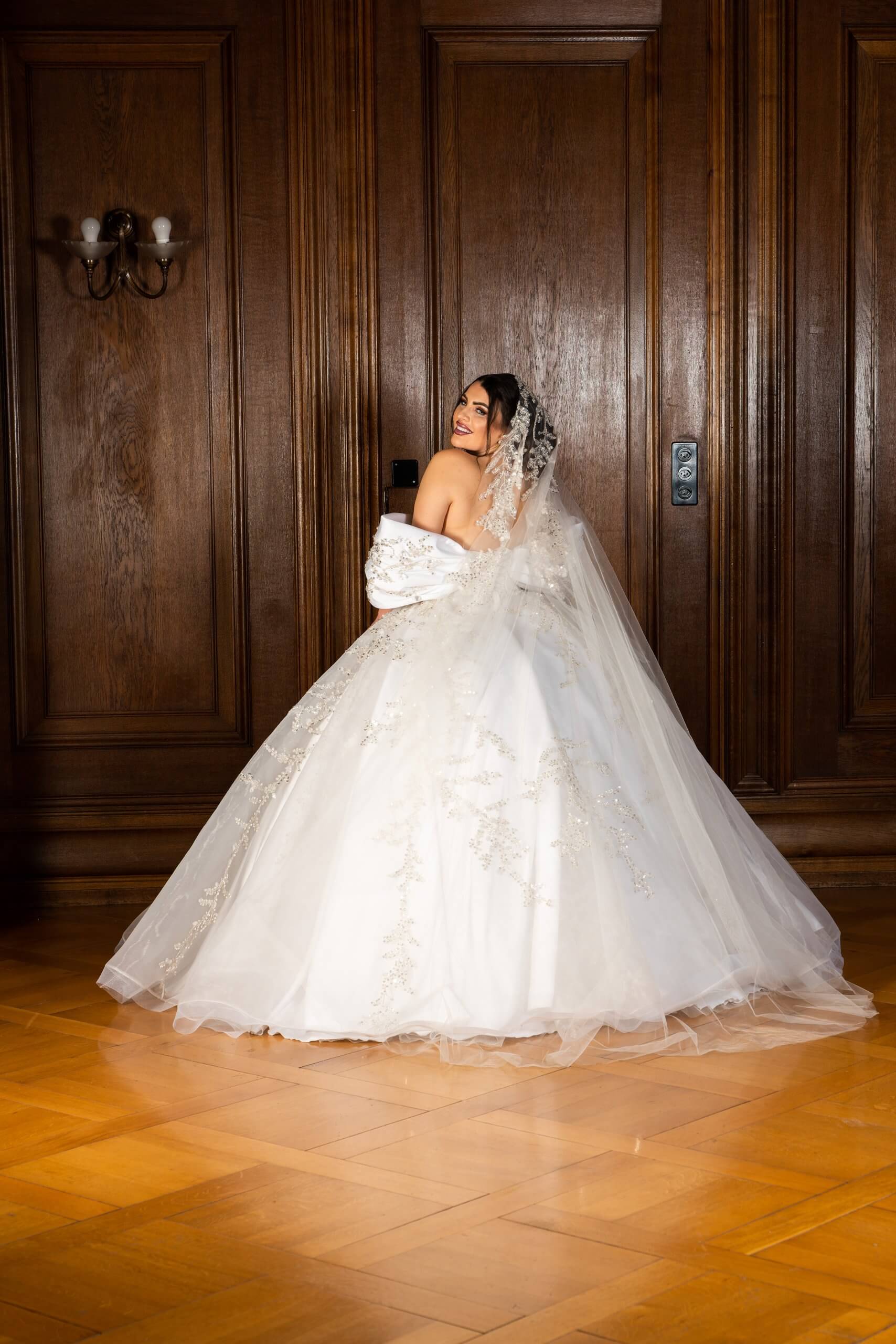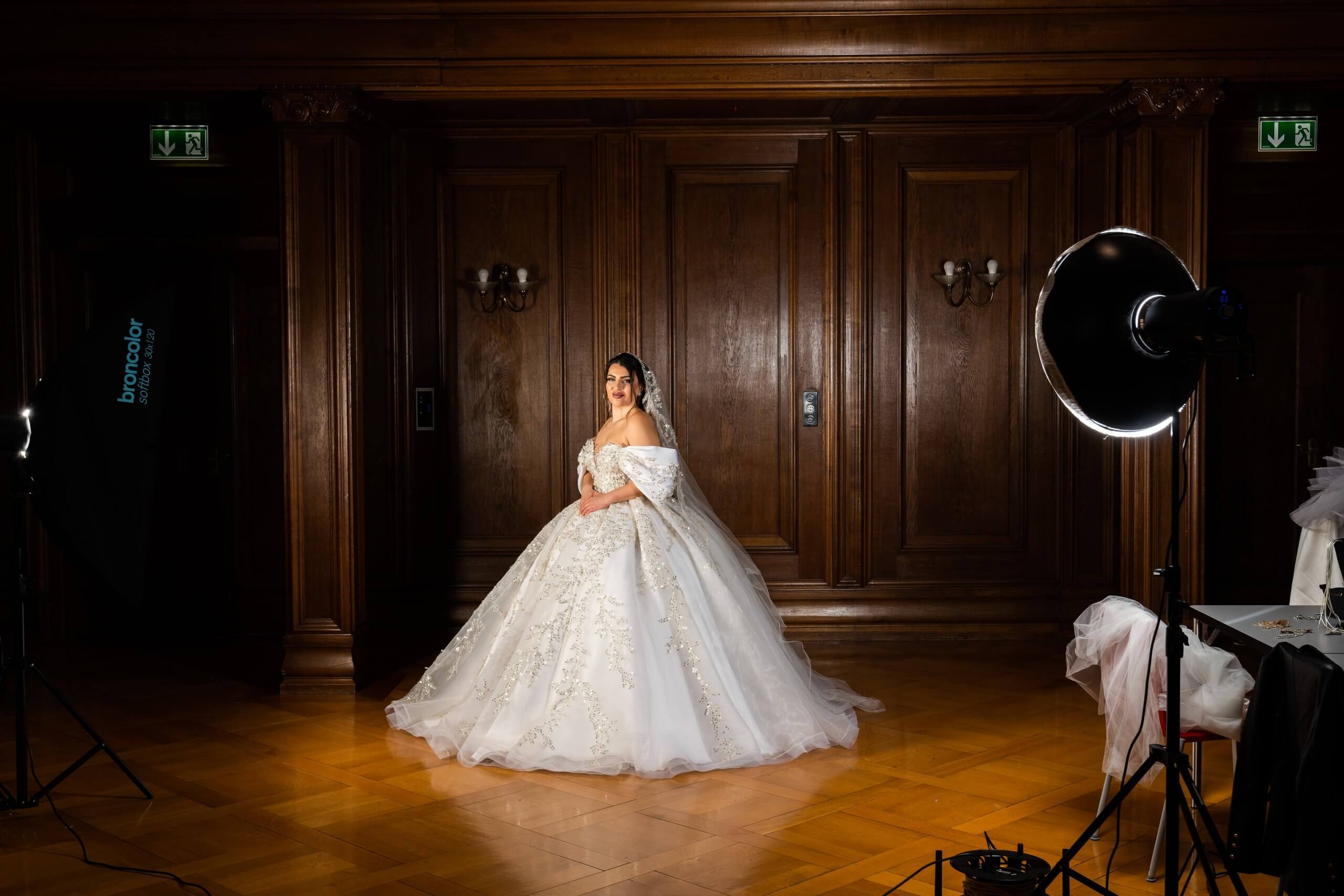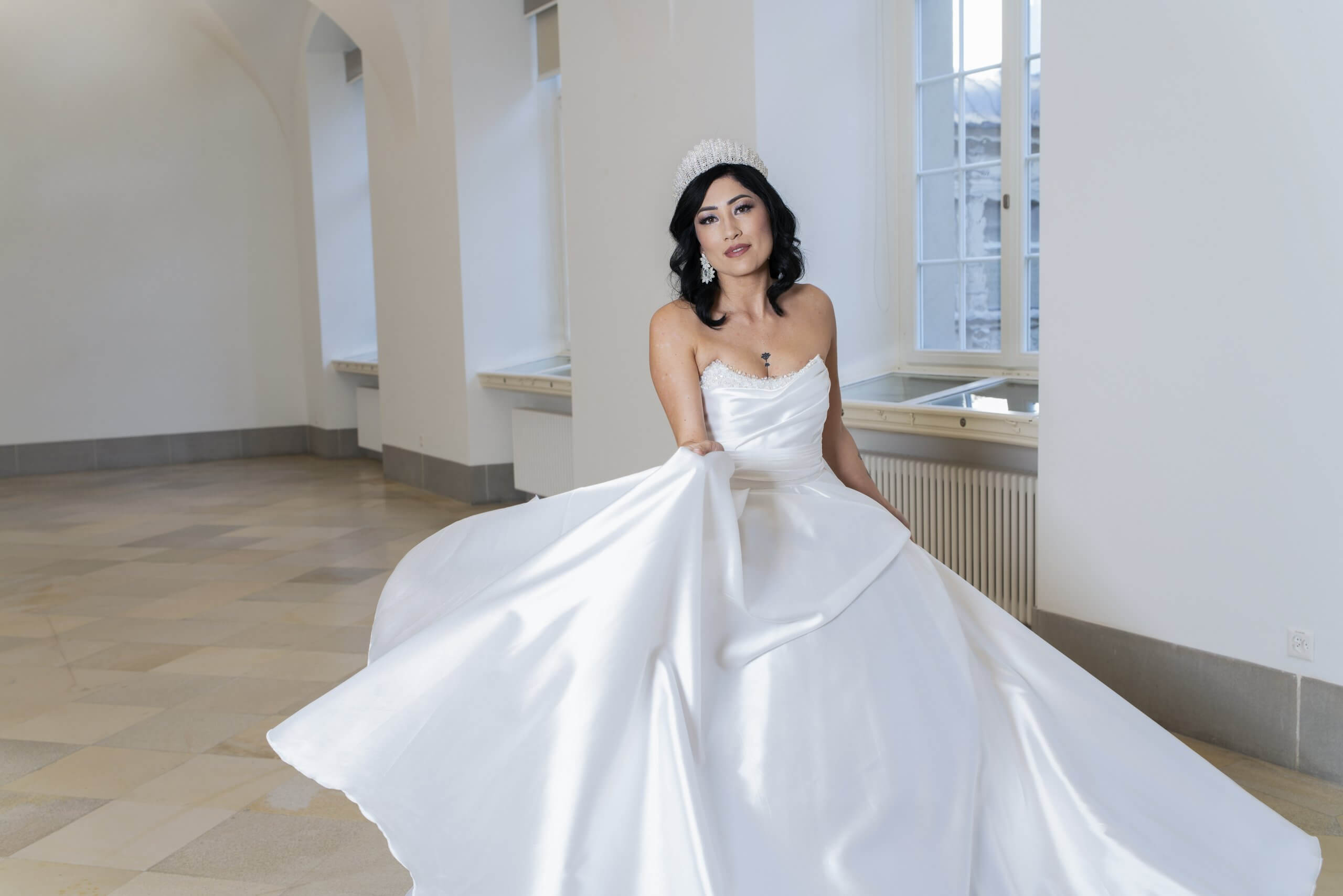 Das Kunstmuseum St. Gallen erwies sich als perfekter Ort für unser Shooting. Die Vielfalt der Räumlichkeiten bot uns unzählige Möglichkeiten, die Schönheit der Brautkleider auf einzigartige Weise einzufangen. Wir waren in einem Raum mit edlen Holzböden und Holzwänden, die das strahlende Weiß der Kleider noch mehr zur Geltung brachten. Dann wechselten wir in eine schlichte Halle, in einen Raum in tiefem Schwarz und sogar ins Treppenhaus. Jeder Ort verlieh den Kleidern eine neue Dimension.